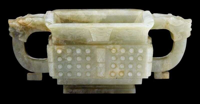 Rectangular section, everted mouthrim and with waist; carved with double beast handles, the body decorated with millet and flanges; raised on tiered rectangular foot; jade of greyish celadon hue occasionally translucent and yellow.