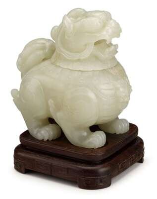Standing figure of a fu dog, with removable head cover, circular opening on body and well-hollowed interior pierced with tiny apertures under tail and in ears; the head is carved with a fierce expression complete with bulging eyes, flared nostrils and open mouth with teeth bared.