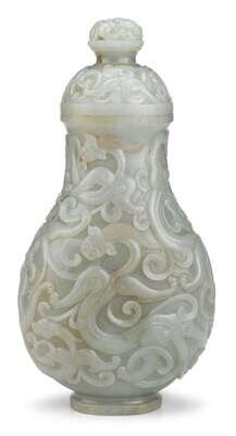 Pear form vase carved to body and cover with coiling qilong and incised with keyfret bands around cover rim, lip and elevated footring.