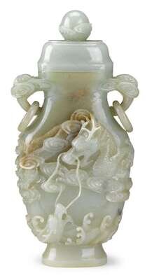 Carved in high-relief to show coiled dragons over celestial ground; with cover and freely-carved rings to shoulders.