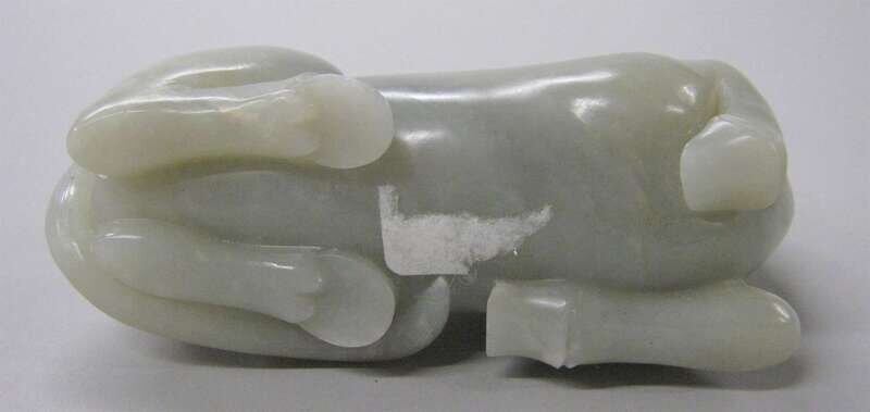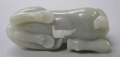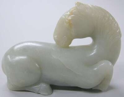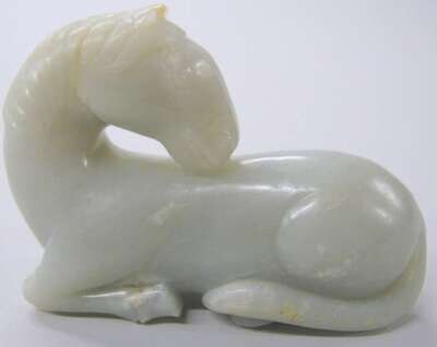 The horse's head turned back, feet tucked under its body but ready to rise; jade with some white specks and a brown russet inclusion across the head.