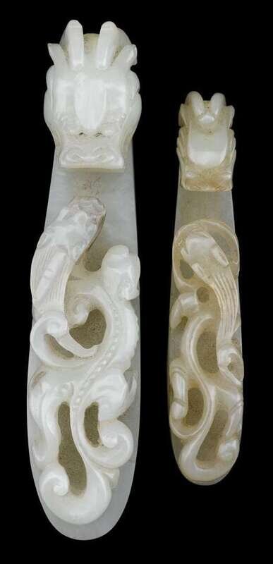 The belt hooks each carved with a scrolling chilong and with a dragon head to the terminal;.