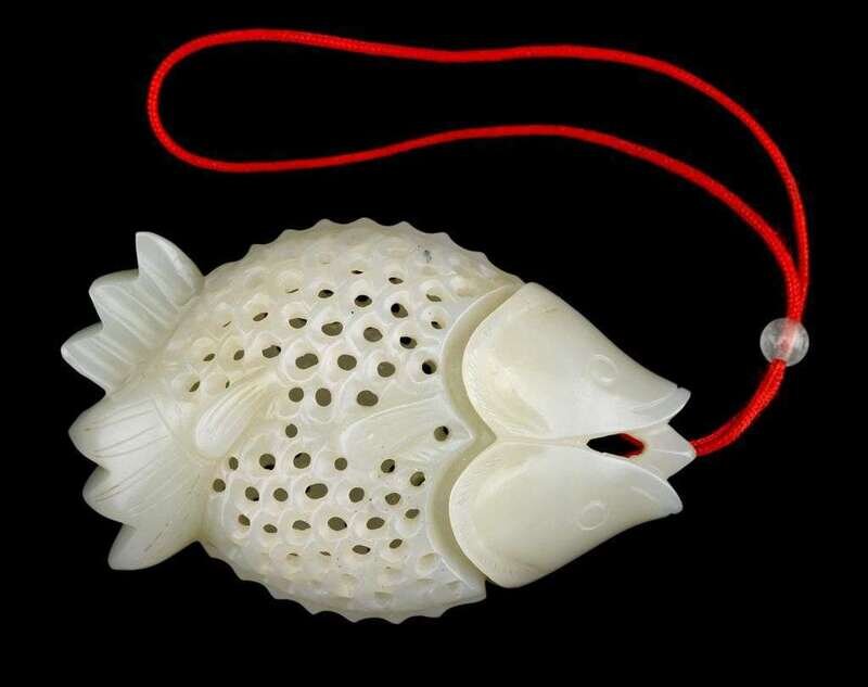 The reticulated pomander with detached cover carved as two conjoined fish; strung.