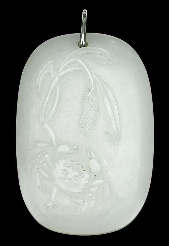 Oval outline carved to show detailed crab and millet stalk, two characters verso, later metal hanging hook.