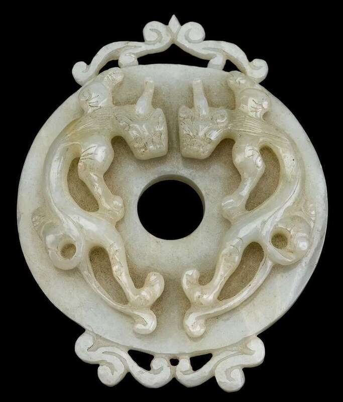 The circular disk surmounted by twin qilong over scrolling bands.