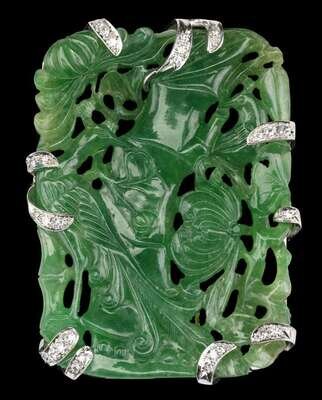 Rectangular form, well carved to show phoenix and bamboo flanked by peony, mounted as a brooch in white gold and diamonds.