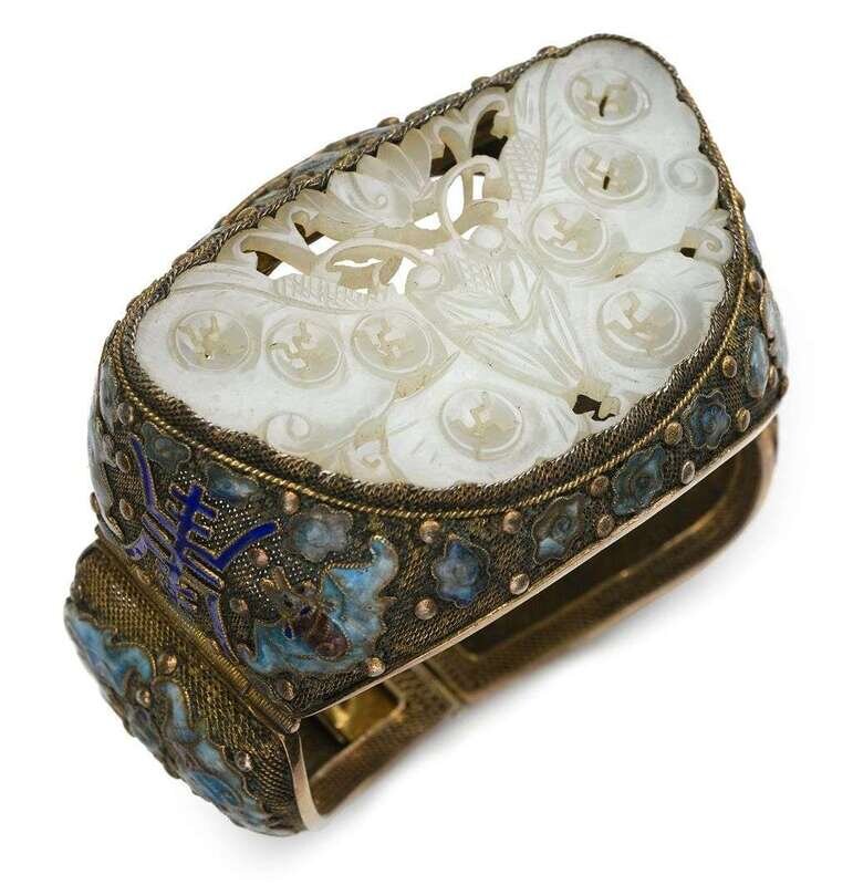 Chinese enameled silver and white jade mounted bangle late qing dynasty