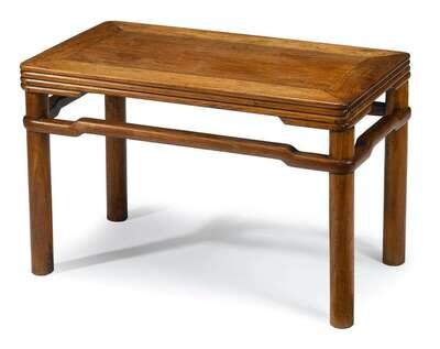 Rectangular top panel set within wide frame, tiered apron and hump back stretchers supported on round legs.