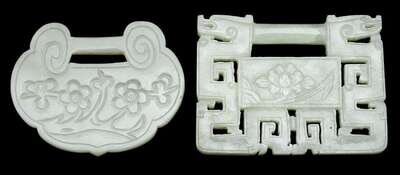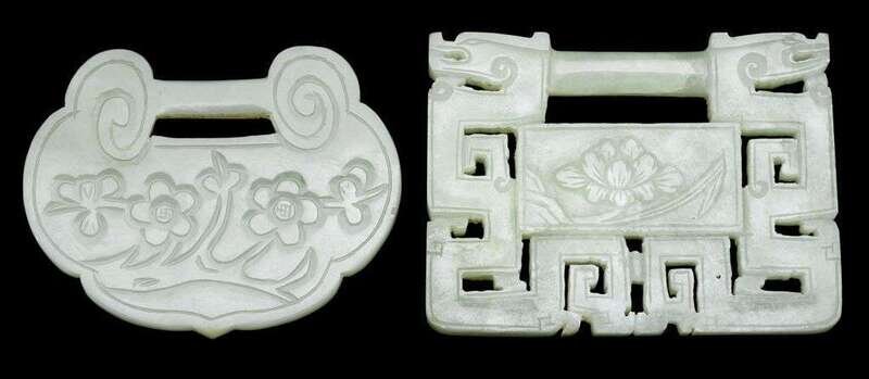 Comprising a ruyi head lock with relief carving and inscriptions, and a rectangular lock with pierced dragon border around a central panel.