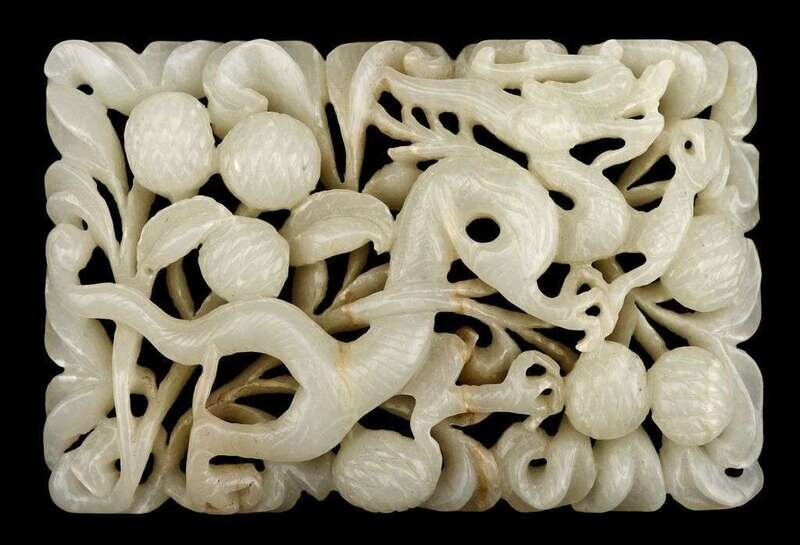 The borderless rectangular plaque carved in openwork with a dragon striding amongst fruit-bearing and intertwined leafy stems; stone of pale grey to white hue.