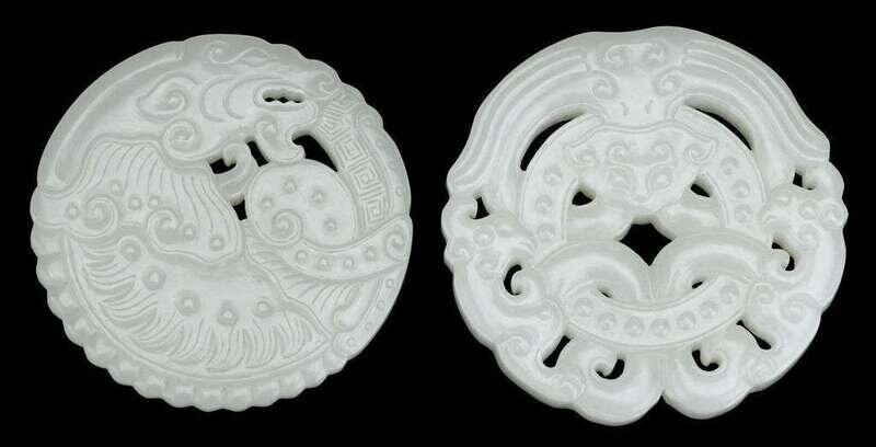 One carved as a coiling fu beast and the other a chilong entwined around a circular jade disc.