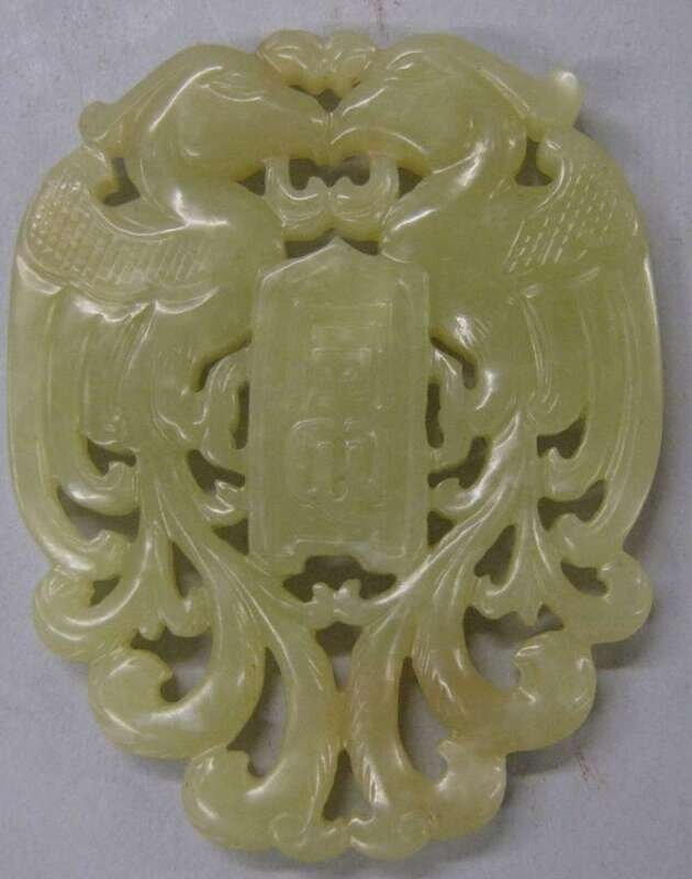 Chinese yellow to celadon jade double phoenix pendant