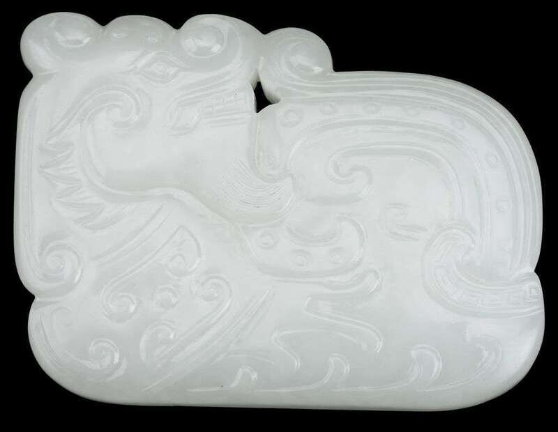 The oblong pendant carved in relief with a recumbent beast turning his head to touch its tail.