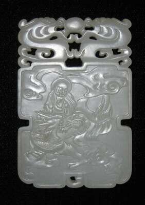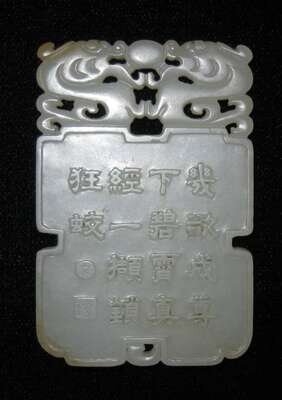 Tall rectangular form, open-work twin dragon top over two beaded panels showing celestial grouping and script verso.