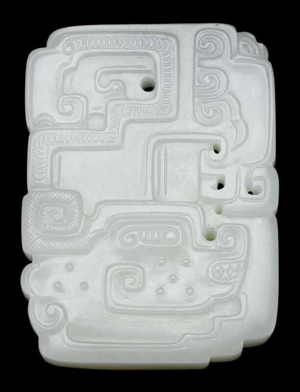 The rectangular pendant carved in the archaic style; of pure white hue.