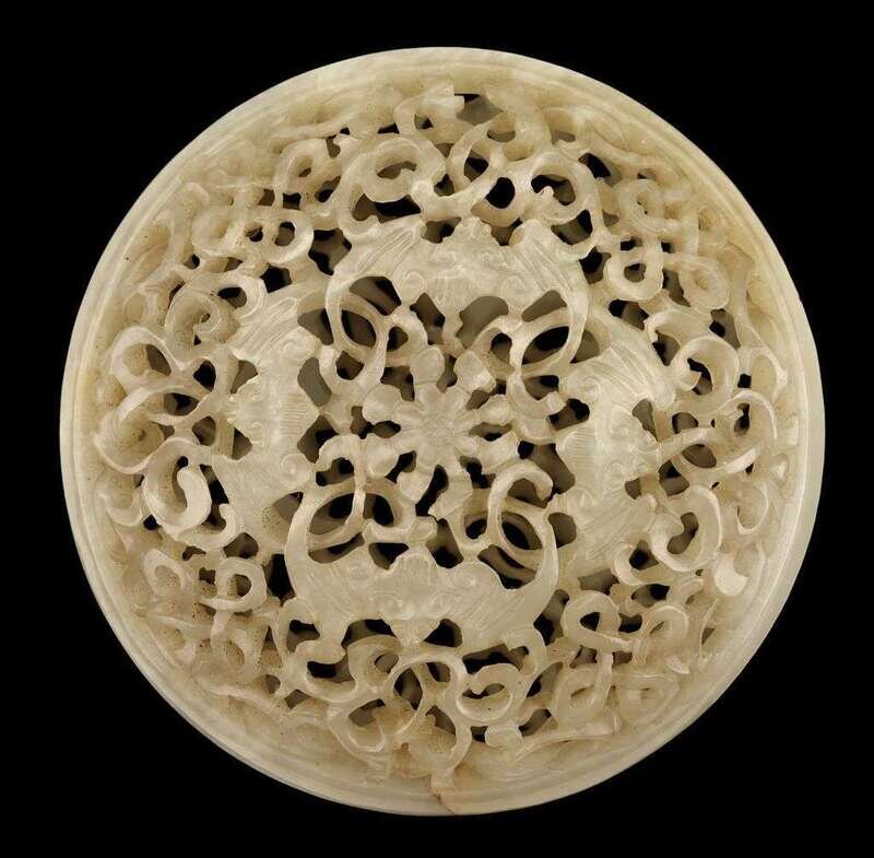 Two circular domed halves carved and pierced with fu bats, endless knots encircling a flower blossom at central position, jade of greenish-grey hue.