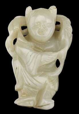 Toggle carved into the shape of a boy holding a lotus branch on his back.