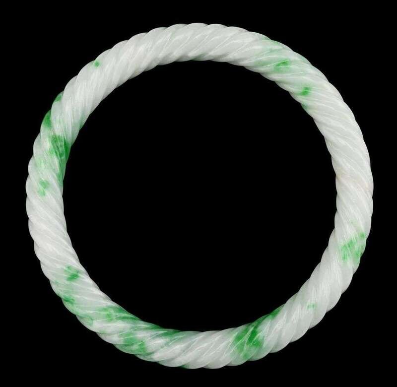 Bracelet is carved in imitation of a rope twist; white jade with apple green highlights.