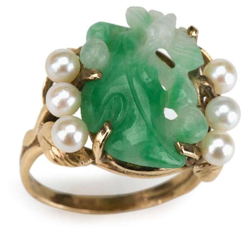 Good Chinese 14k yellow gold, seed pearl and jadeite ring 19/20th century