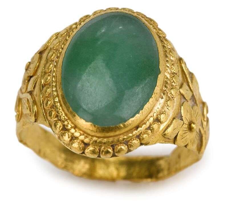 A gold Chinese ring with jadeite stone and ornate floral accents.