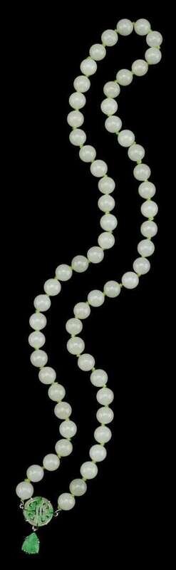 Composed of sixty-one translucent beads with silver and jadeite clasp.