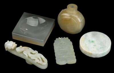 A group of various stone items consisting of an agate snuff bottle, an agate water dish, a jade weight, a jade plaque, and a jade garment hook.