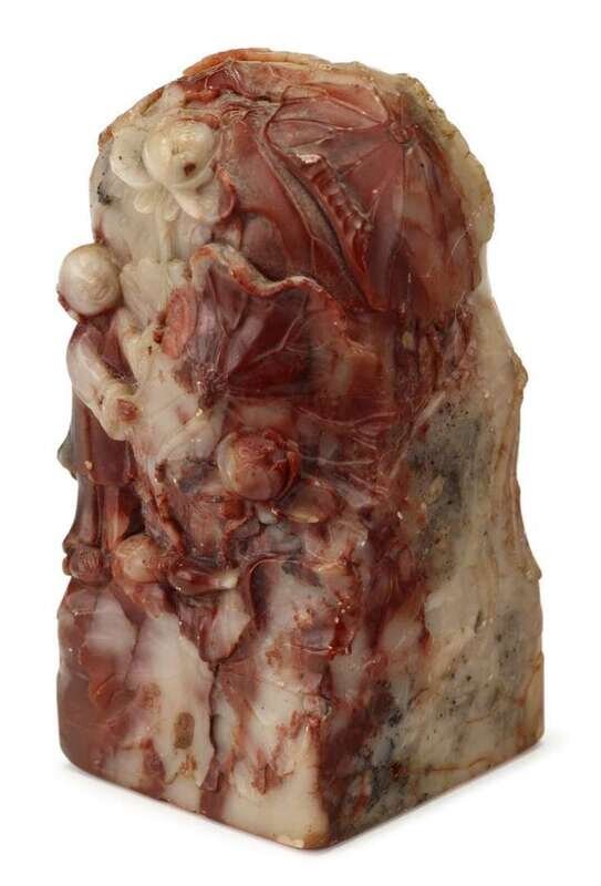Rounded pillar form, carved in good relief to show figures and lotus blossoms.