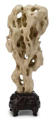The creamy white vertical lingbi limestone of convoluted form and smooth surface texture, delicatedly balanced on narrow end, set in burlwood plinth.
