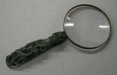 Of typical form with qilong head hook and openwork qilong to body; mounted to a magnifying glass.