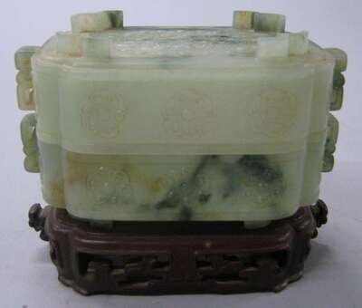 Of rectangular, twin handled form; adorned with archaic decoration; the top and bottom halves of identical form.