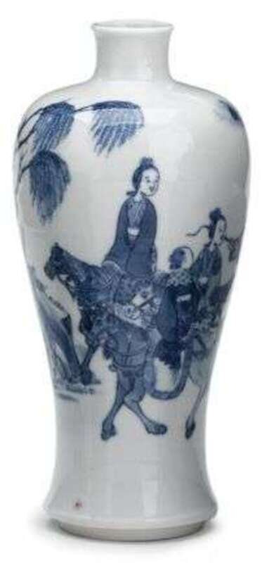 The high shouldered vase decorated with a continuos scene depicting a scholar speaking to four maidens on horses, a willow tree in the background.