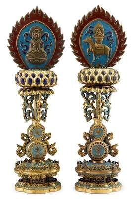 Enameled, gilded, and hardstone inlaid; each cast in the form of a mandorla enclosing a boddhisattva and a horse carrying symbols of wealth; atop a lotus pod supported on a double gourd stem, flanked by openwork scrolling vines and raised on lobed base with openwork apron.