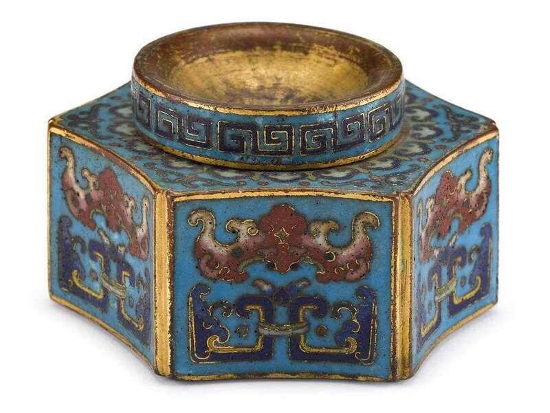 Of hexagonal form, decorated with inlay of fu bats on each side and geometric patterns under base.