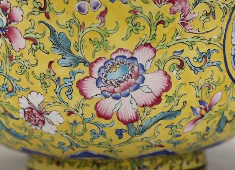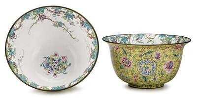 Fine pair of Chinese Beijing painted yellow-ground enameled bowls 18th century, possibly imperial