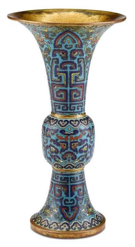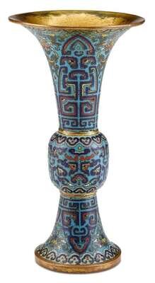 The vase with trumpet mouth and base, globular at waist, enameled with archaic scrolls to exterior and gilt to interior.