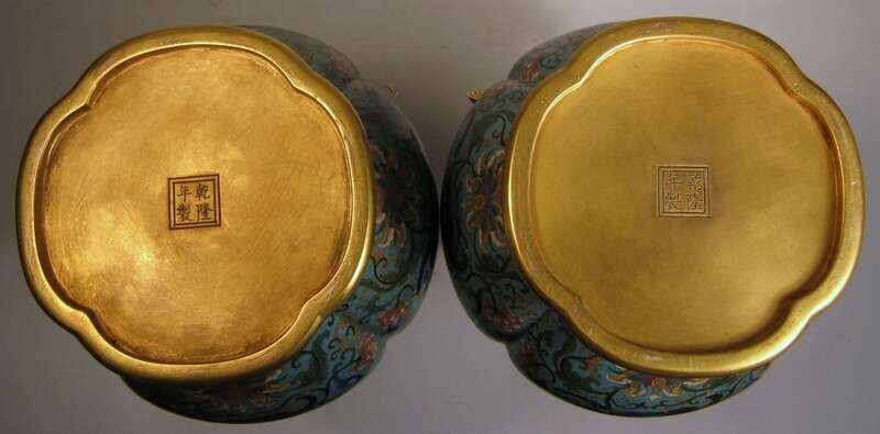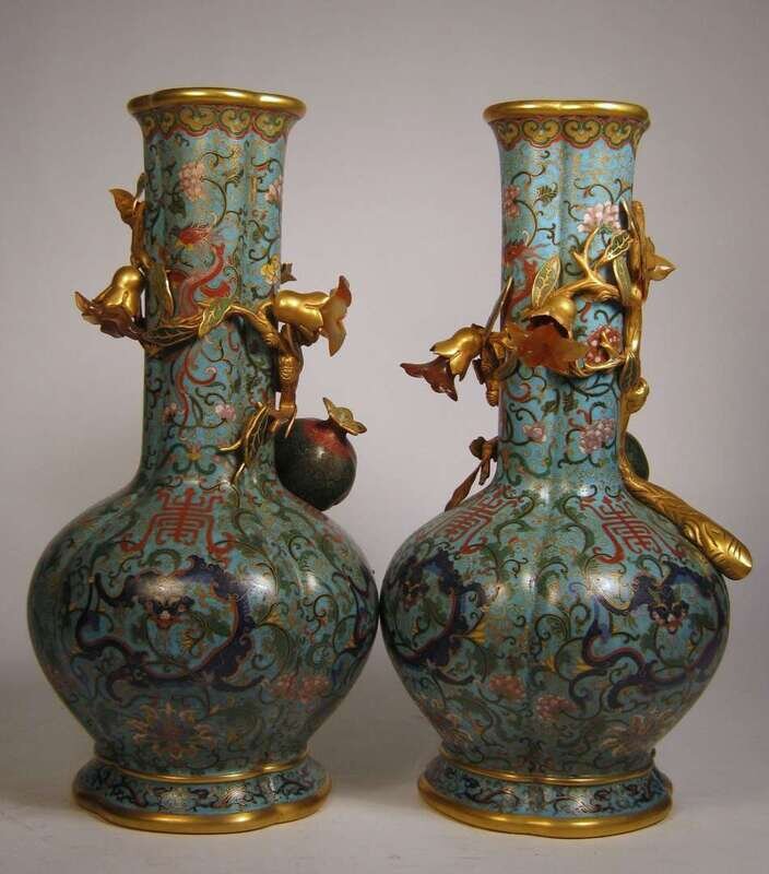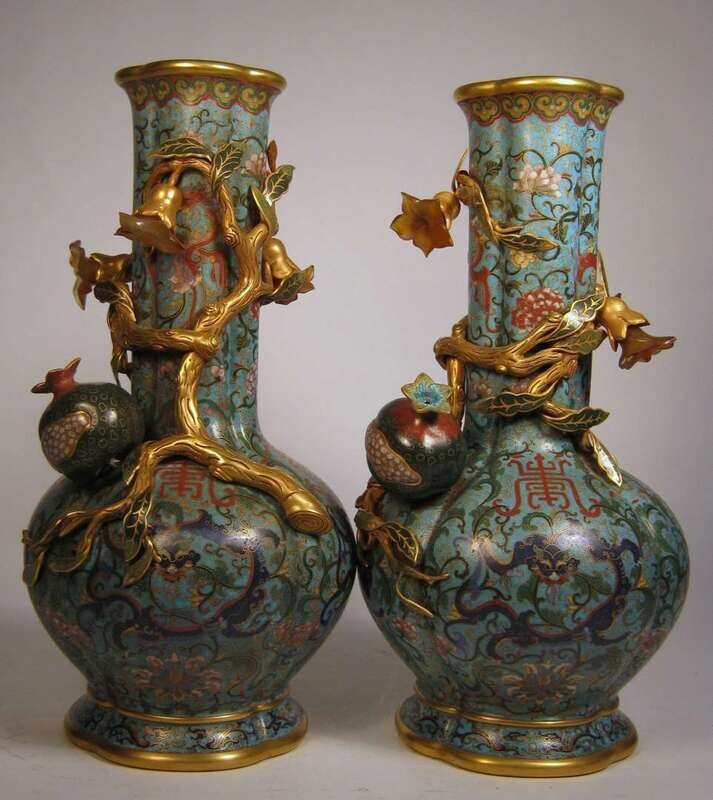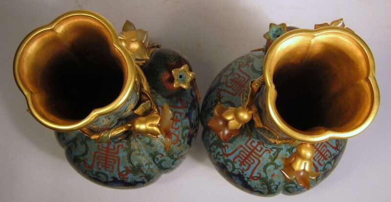 Pair of Chinese gilt metal, cloisonne and carved agate mounted vases qianlong mark; 19/20th century