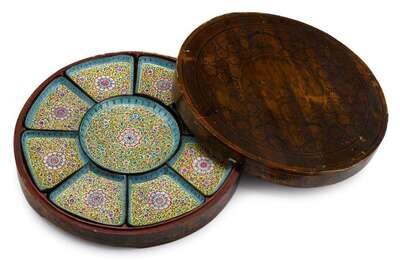 Comprising a circular dish set centrally within eight fan-shaped dishes, each decorated in floral patterns and accompanied with matching box.