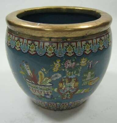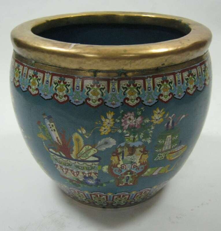 The large ovoid jardiniere decorated around exterior with precious and auspicious objects and flowers between archaic bands at rim and foot.