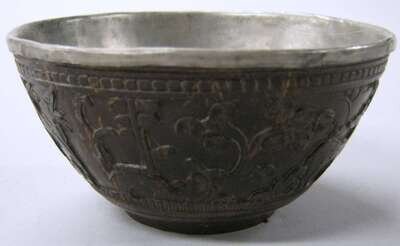 The bowl crisply carved with a continuous band of bird, deer, pine, peony and bamboo between dove and lappet bands, raised on circular footring and interior lined with silver.