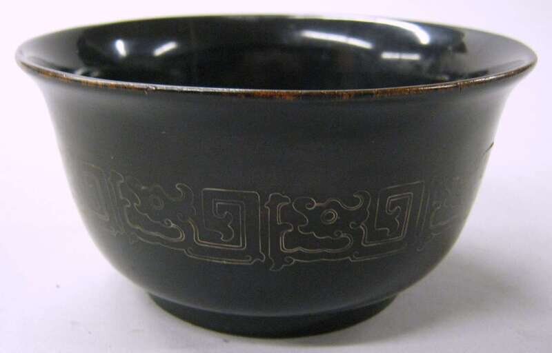 The bowl with deep sides rising to a slightly flared rim, coated in black lacquer and inlaid with a single archaistic band around body.