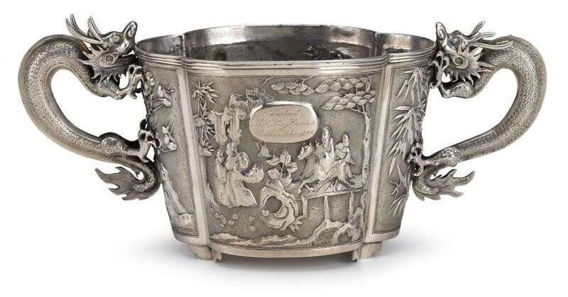 The quatrefoil body raised on four feet cast with flowers and a dedication; flanked by double dragon handles; Jiaji silver mark to base.