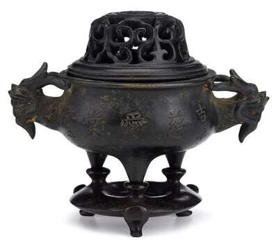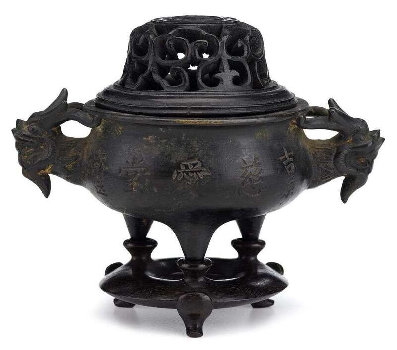 Small Chinese bronze censer with wood cover and stand xuande mark , 17th century