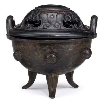 Deep U-shaped body applied with disks, over three tall shaped feet, later 19th century wood cover.