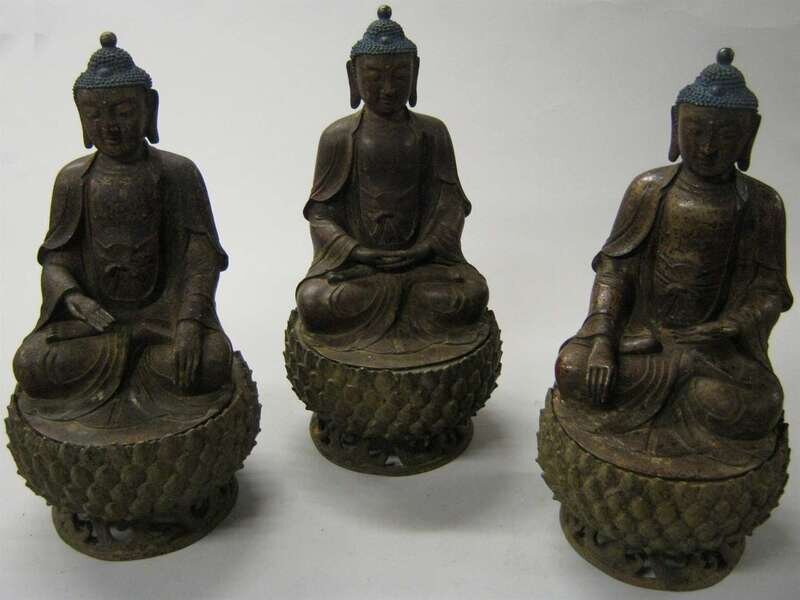 The three buddha seated in dhyanasana with hands in different mudras and hair in tight polychrome curls, fitted to lotus thrones.