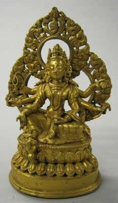 the six-armed figure holding a collection of attributes, seated on double lotus base and backed by a mandorla.