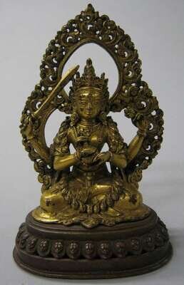 the figure seated in full lotus dressed in ornamental jewelry, draped with garland of skulls, holding various attributes including a sword, surmounted with a crown and a miniature seated Buddha figure, backed by a detachable mandorla.