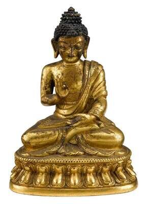 Gilt patina, seated in mudra, over double lotus throne.