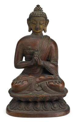 A copper figure of Buddha seated full lotus in uttarabodhi mudra on sealed lotus base.