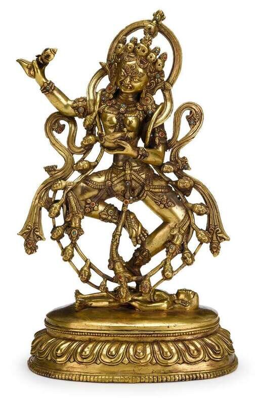 The figure powerfully cast in a tantric stance holding a vajra in right hand while the left contains an attribute, adorned with garland of severed heads wearing inlaid ornaments and surmounted with a five skull crown, the face depicting a fierce expression while resting on preta and supported by lotus base, unsealed.