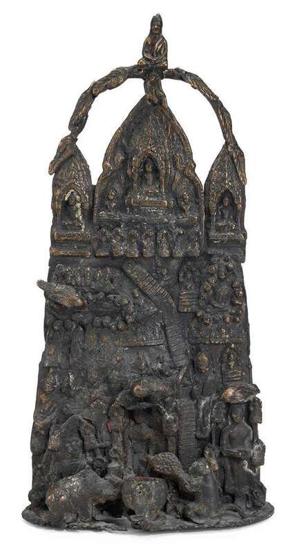 Brown patina, surmounted by seated bodhisattva, over a profusion of celestial and animal figures centered by a serpent supported bowl.